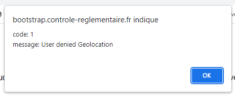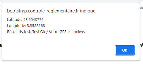 Un pop va s'afficher. Si votre GPS est activé, le Pop Up indiquera votre position GPS (Latitude/Longitude) et un message Résultats test : Test OK / Votre GPS est activé.